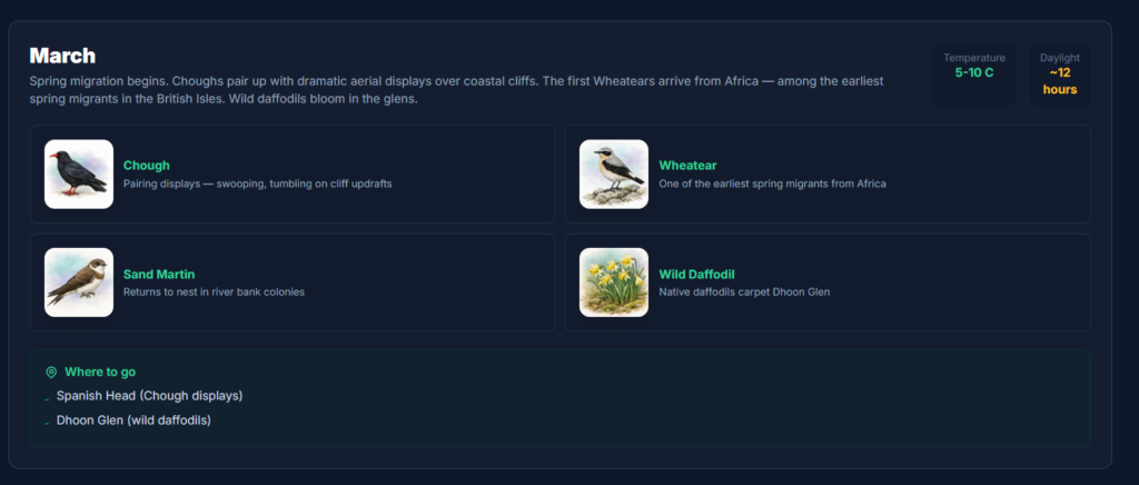We’ve also built a seasonal wildlife calendar – a month-by-month guide to what you might expect to see on the Island – and used AI to generate illustrations of Manx wildlife to make the data more accessible and browsable.